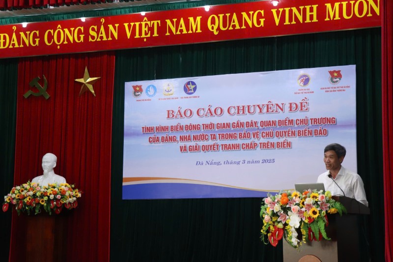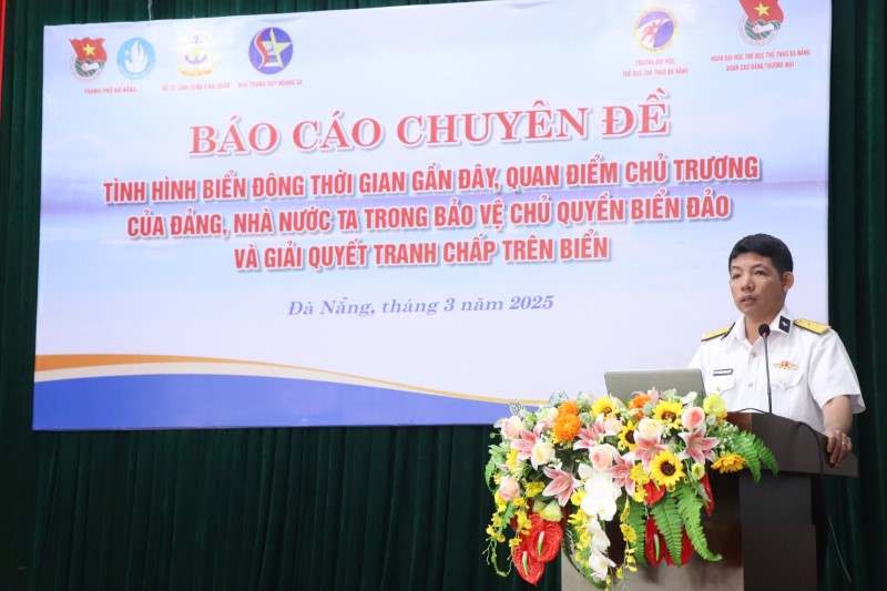 Tại chương trình các bạn đoàn viên, sinh viên được Trung tá Trấn Quang Long - Chính trị viên Hải đội 315, Lữ đoàn 172, báo cáo chuyên đề về tình hình biển đảo năm 2025.