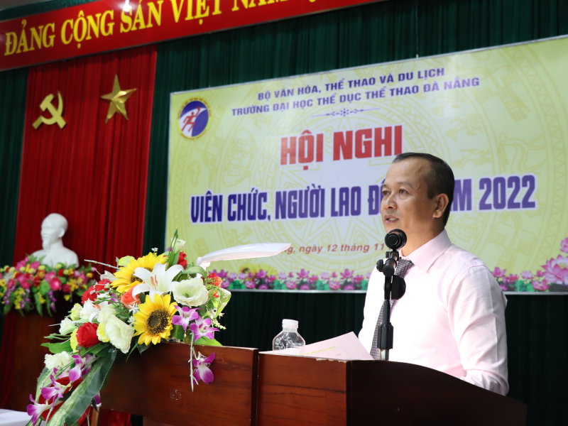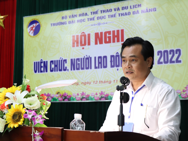 Tại Hội nghị VCNLĐ năm 2022, thay mặt BCH Công đoàn Trường Đ/c Lê Minh Tuấn - Chủ tịch Công đoàn Trường trình bày báo cáo tổng kết phong trào thi đua năm học 2021 - 2022 và phương hướng nhiệm vụ phong trào thi đua năm 2022 - 2023. Trong đó nêu rõ trong năm 2022 viên chức, người lao động Trường Đại học TDTT Đà Nẵng đã thực hiện đúng chủ trương, chính sách pháp luật của Đảng và Nhà nước. Thực hiện yêu cầu dân chủ hóa trong trường học, thực hiện sự đổi mới trong giảng dạy Nhà trường, các đơn vị chuyên môn đã phối hợp chặt chẽ với Công đoàn tổ chức cho VCNLĐ xây dựng các quy định, quy chế hoạt động và thực hiện tốt Nghị quyết Hội nghị VCNLĐ của năm 2022.