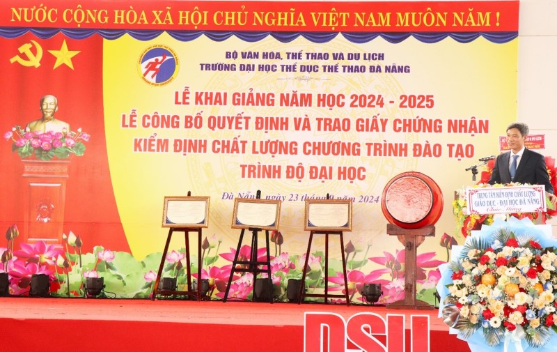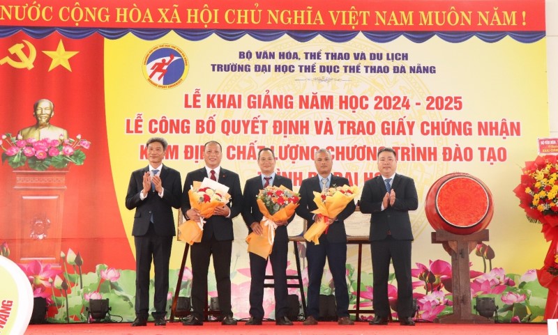 Nhân dịp này, Trường Đại học Thể dục thể thao Đà Nẵng đón nhận Giấy chứng nhận đạt tiêu chuẩn chất lượng giáo dục do Bộ trưởng Bộ GD&ĐT ban hành đối với 3 chương trình đào tạo đại học ngành Giáo dục thể chất, Huấn luyện thể thao và Quản lý Thể dục thể thao.