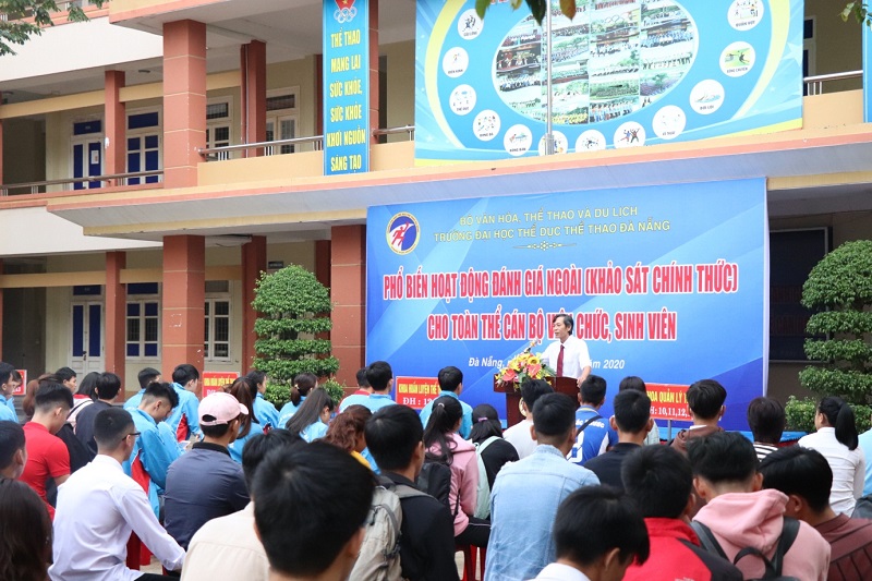 Thực hiện kế hoạch số 1008/KH-TDTTĐN ngày 16/10/2020 của Hiệu trưởng Nhà trường về việc tổ chức công tác Đánh giá ngoài (Khảo sát chính thức) Trường Đại học TDTT Đà Nẵng năm 2020. Sáng ngày 02/11/2020 tại lễ chào cờ, lãnh đạo Nhà trường chỉ đạo các đơn vị chức năng phối hợp tổ chức “Phổ biến hoạt động Đánh giá ngoài (Khảo sát chính thức) cho toàn thể cán bộ viên chức, sinh viên”. Nhằm chuẩn bị phục vụ công tác Khảo sát chính thức tại Trường Đại học Thể dục Thể thao Đà Nẵng từ ngày 23/11/2020 đến 28/11/2020. Tham dự buổi lễ chào cờ và nghe Phổ biến hoạt động Đánh giá ngoài có PGS. TS Phan Thanh Hài - Hiệu trưởng, các đồng chí trong Ban giám hiệu và toàn thể CBVC, SV Nhà trường.