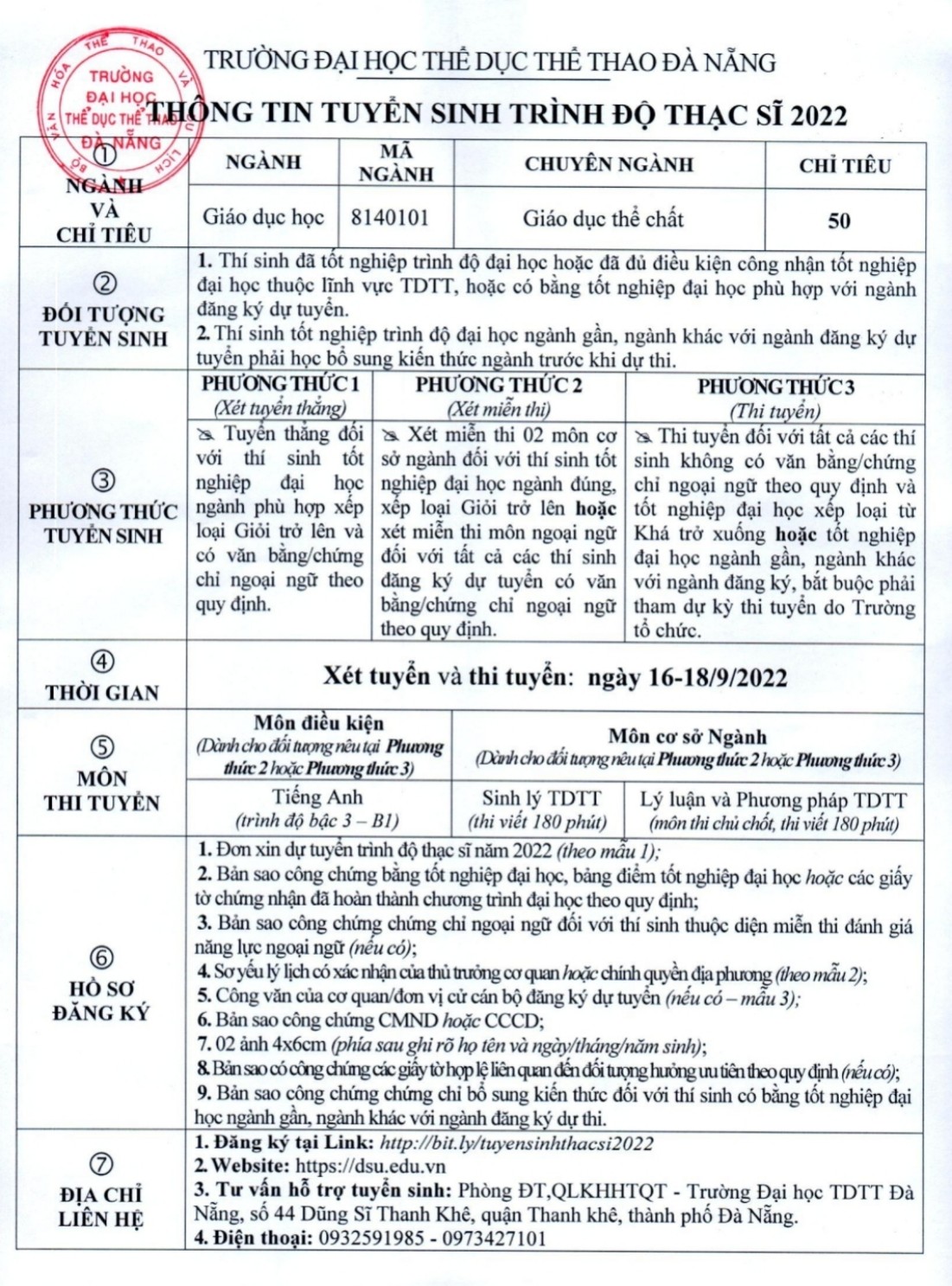 Tư vấn hỗ trợ tuyển sinh: Bộ phận Tuyển sinh - Trường Đại học TDTT Đà Nẵng, số 44 Dũng Sỹ Thanh Khê, quận Thanh khê, thành phố Đà Nẵng.